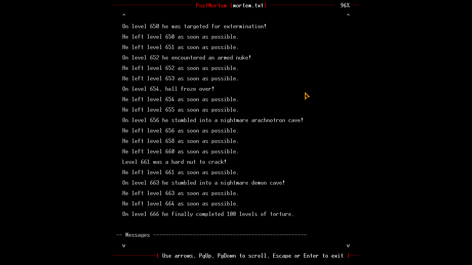 Also a nitpick, but at the end of a successful A666 mortem, it says you "finally completed 100 levels of torture", not 666: