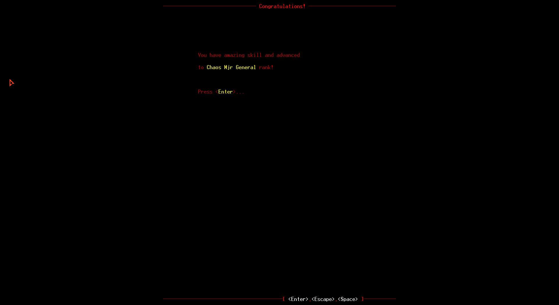 So overall, this took about a dozen attempts over the course of less than two hours, which is a pretty stark contrast to when pure Quartermaster Diamond took me over three times the amount of attempts over the course of several days. I wouldn't necessarily say this was easier than pure Quartermaster Diamond though, I would chalk up the difference to my improvement since then, not being as optimal with my trait selection (notably if I redid Quarter Diamond, I wouldn't have gotten Int2 and would have instead gotten Finesse, Reloader if playing a version after 0.9.9.8, or would have only delayed Blademaster for Int1), and some plain old lousy luck in those Quartermaster Diamond runs (I'll never forget how many attempts it took me to just find a Rocket Launcher by early Deimos...), so any aspiring players should definitely not skip getting Quartermaster Diamond before going for this badge. If anyone is going for Quartermaster Angelic though and are struggling with it on UV, perhaps try it on N!, especially if you're playing on 0.10-onward and so don't even need to worry about respawns negatively affecting the kill count. My sixth Angelic secured, I get the rank of Chaos Major General, joining Tormuse and papilio as the only players I believe to have verifiably achieved that rank. With that all said, here is the mortem: