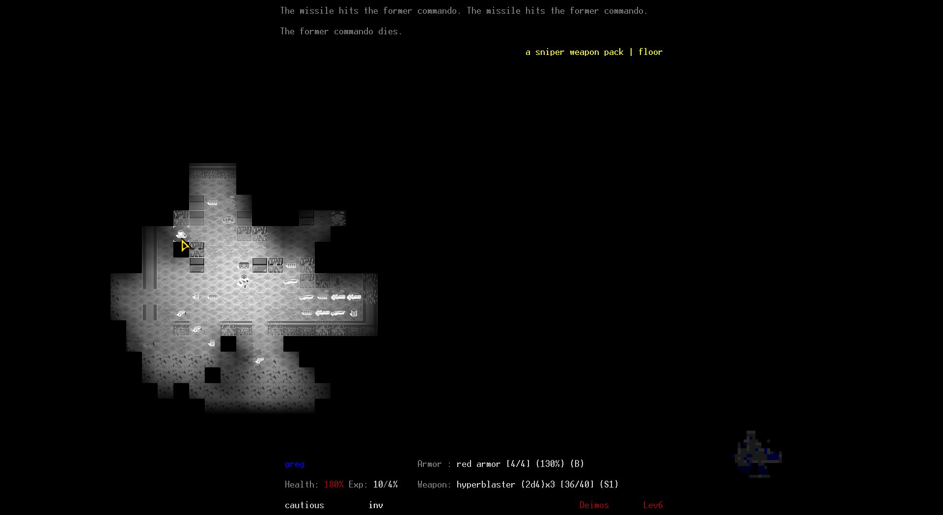 The next special level is The Wall, which with a Rocket Launcher found on Deimos 2, I'm able to go in and clear it easily. I reach WK2 there and so I'm able to build the Hyperblaster plus slap the Sniper Mod on it. It is then City Of Skulls, which with a PPT Assault Shotgun and still having the Shell Box from Armory intact, is also easily beaten, while I get one of each Skull; I obviously take the Hatred Skull, being the most useful item for Mortuary/Limbo by far, but I also take a Blood Skull, since it would allow me to gib the corpses around the Nuclear BFG without risking destroying it nor having to use the aforementioned Hatred Skull there (which I would much rather pop immediately). The normal Deimos floors weren't particularly remarkable up to this point, with me getting an unusual high amount of small rooms levels, but in Deimos 6 I would find a second Sniper mod. Unfortunately I'm not playing a Technician in 0.9.9.8 or later, where I then could have gotten WK3 and put a second Sniper on my Hyperblaster to blast away at out-of-vision enemies as much as I want, but it's still very nice to build a Plasmatic Shotgun with a spare Power Mod I had lying around in my inventory just to make corpse disposing in Nightmare less tedious. For the next special level, I was really hoping I got Spider's Lair, as aside from being much easier on N! than Halls Of Carnage, the latter level simply would have been way too dangerous for a build with no HR, only A-modded Steel Boots, no speed-boosting armor, and while I had no Homing Phase to just zip immediately to the BFG. I could have maybe done it with lots of rocket jumping, but even if that worked, I probably would have severely burned through my armors and medkits doing that + getting through the Nightmare enemies in the maze, so I was going to just skip it and accept doing Mortuary/Limbo without the BFG if Halls spawned. Fortunately it was Spider's Lair that spawned, which I was able to go in and clear for the easy BFG.