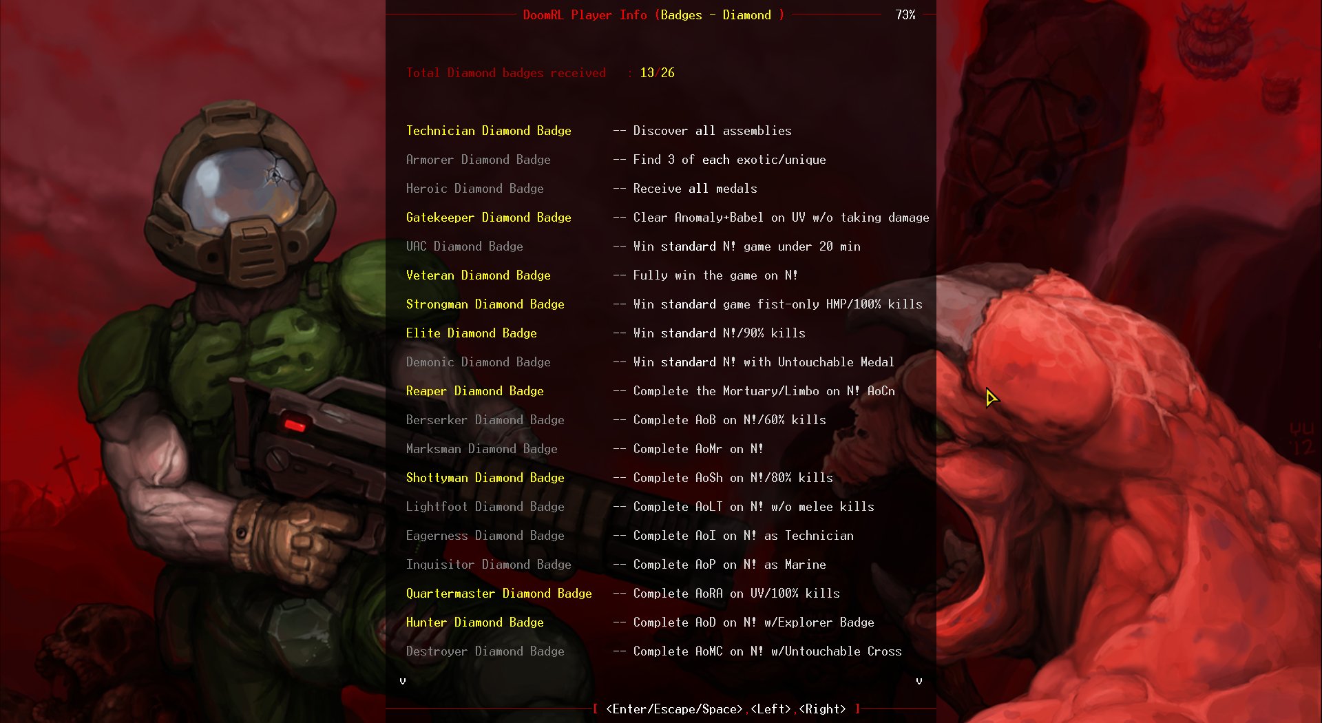 At this point, it's just making it to Mortuary/Limbo now. Cybie goes down without much of a fight, the first few Hell floors are unremarkable other than me finally getting Ammochain, and I skip Cathedral as I'm unable to beat it with what I have (an Invuln spawned on Hell 1 but no nuke), while I then skip the Vaults as I didn't even have a Phase Device to try gambling and I didn't want to throw the 100% kills I had going by only partially clearing it. In Hell 4 I would get a rather nasty frozen event in a maze, but thanks to the S-modded Hyperblaster and juiced up Assault Shotgun, I'm able to fight without good cover and kill everything without burning Medkits. In that maze I at least then find I get Mortuary, the much harder of it and Limbo in this version, and I'm thoroughly prepared for it. In Mortuary, I employ my usual opener of immediately popping a Hatred Skull, Hyperblaster down an Archvile blocking the way, then rocket jump to the eastern area, shoot some BFG blasts to blow up most of the corpses in the right area, rocket jump farther right, pop the Blood Skull to destroy the corpses around the Nuclear BFG and then rocket jump to the Nuclear BFG. With the Nuclear BFG secured, I then rocket jump back to the western side of the map, blow up most of the corpses there with the BFG that haven't gotten up yet while berserk + P-modded Red Armor lets me tank the hits from all the enemies around, and then rocket jump back out to the foothold I had set up on the eastern side. With this successful opening that takes out most of the corpses, Mortuary maxes out with no more than a few dozen enemies up at once, at which point it's a fairly easy mop up and I finish N! Mortuary with less than 100 damage taken. I could just kill myself at this point and get Reaper Diamond, but I finish out the run and go for the full win to kill Carmack for good measure (and to help build towards Apostle rank, which I'm not so far from now). With Reaper Diamond, I'm also halfway towards getting all the Diamonds in 0.9.9.7.