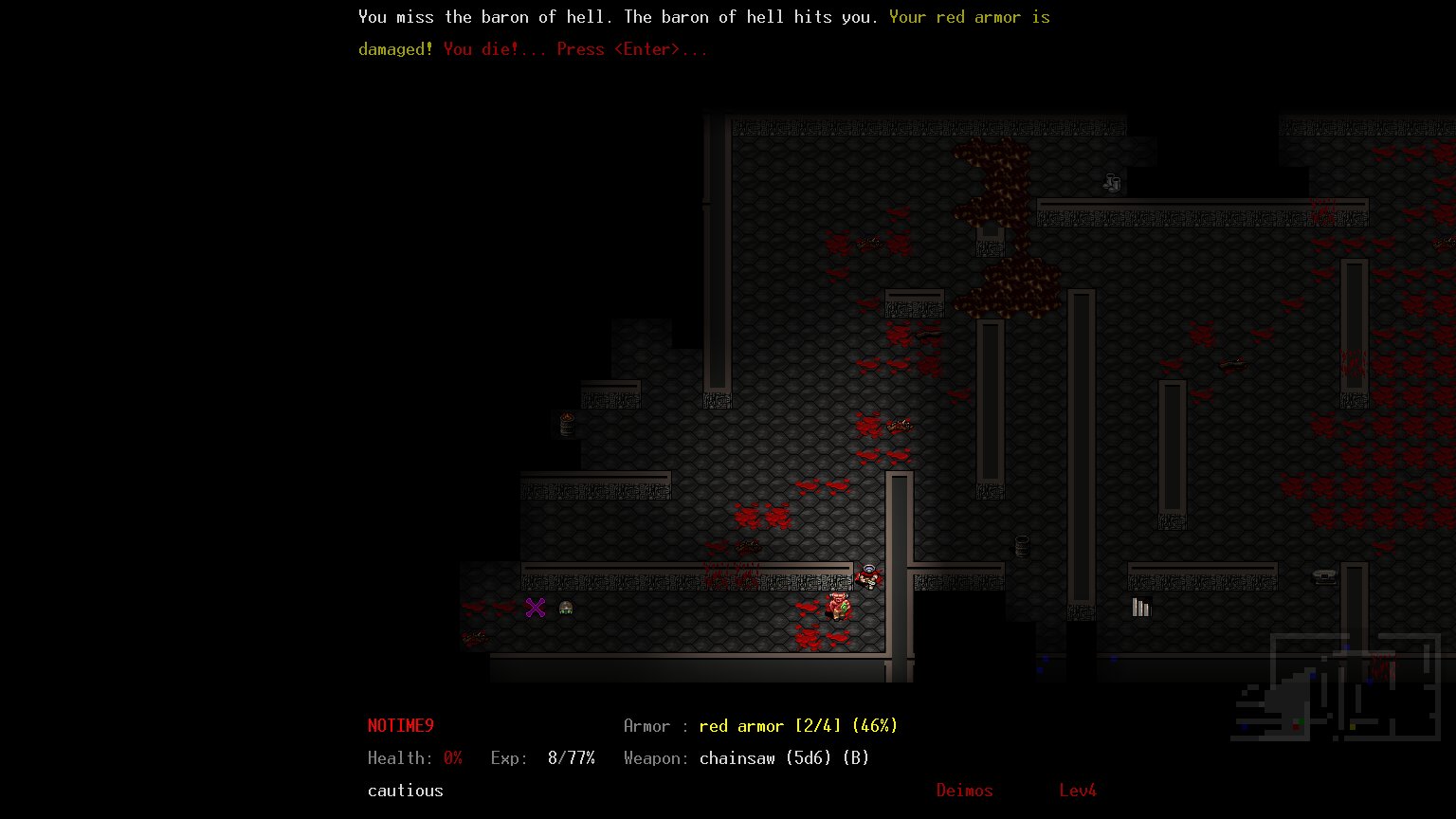 - Had a particularly scary moment somewhere in the 200s when I was meleeing a Nightmare Cacodemon after my berserk worn off and it brought me down to 7%. It was almost dead and so I could have killed it then heal, but I wasn't going to risk the run this deep to the always present minimum 2% miss chance, especially when I still have bad memories of it costing me a Quartermaster Diamond run halfway through Deimos when I missed finishing off a nearly dead Baron before healing in a similar situation...